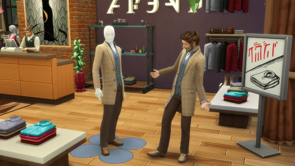 At a boutique, your Sim can set up mannequins with fashions you’d like to sell. With enough customers, you can set a clothing trend.