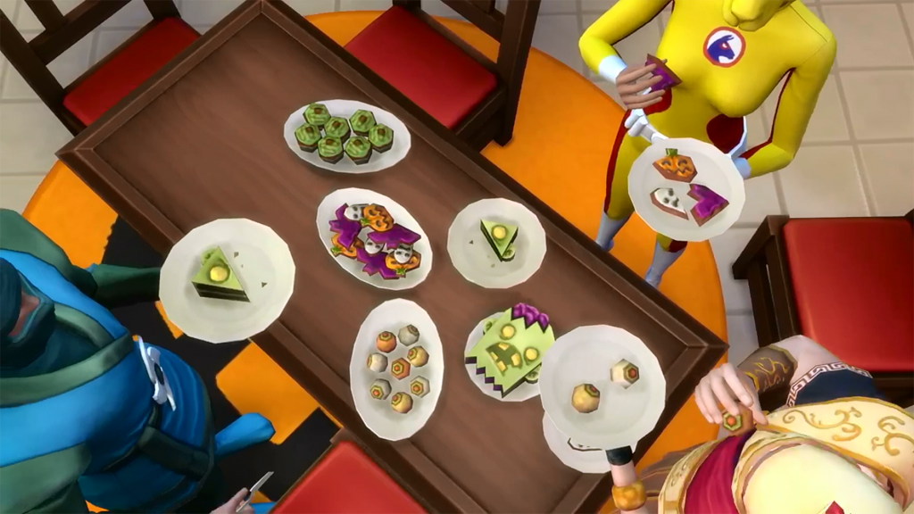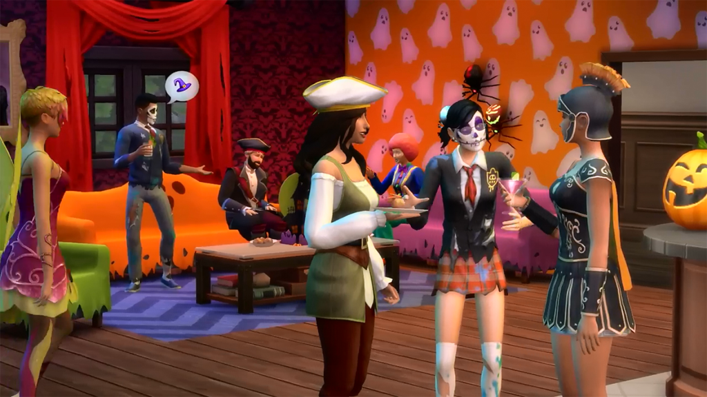 Dress up in a pirate, witch, fairy, ninja, or even a llama superhero costume for the new Spooky Party social event. Dust off those old Deluxe Edition costumes for even more fun. Transform your home into a haunted house with ghastly decor, like pumpkins, spiderwebs, tombstones, and unsettling paintings. Lastly, serve up three new ghoulish delights, including an Eyeball Cheese Plate, Zombie Cake, and Spooky Cookies. Try asking your guests for treats with a new social interaction, but watch out for tricks!